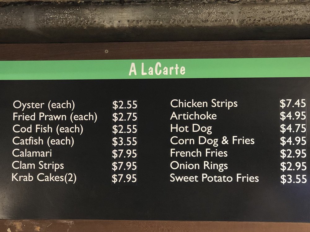 Coleslaw, Dijon mustard, hot sauce, and clam strips on a toasted sour roll.